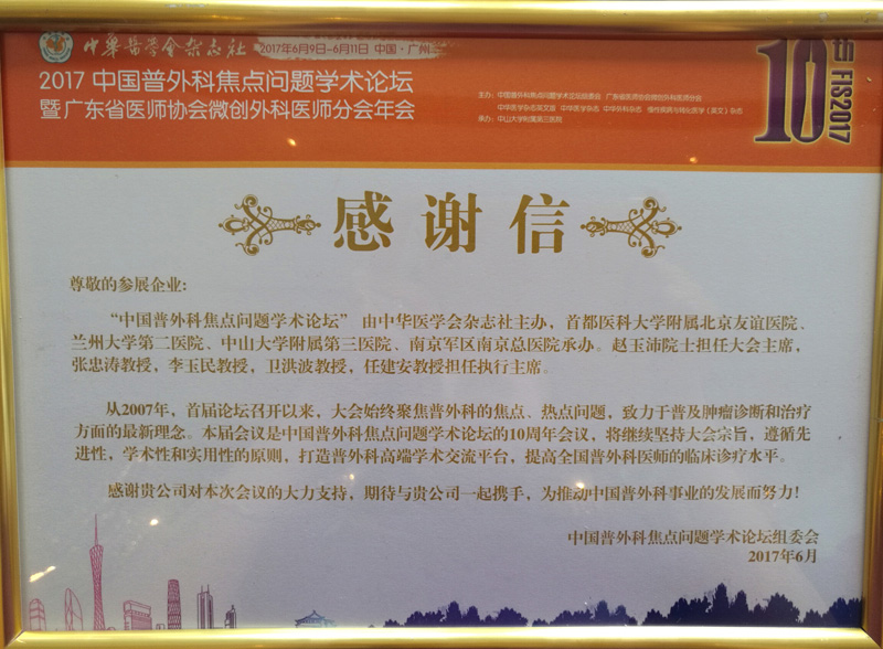 本次會議,我司參會人員積極配合主委會開展各項會務工作。因此,大會主辦方為我公司頒發了感謝信,這是對我們努力付出極大地認可與肯定,我們將繼續努力,讓更多的人認識了解我們的品牌,一起開創我國醫療事業更加美好的未來!